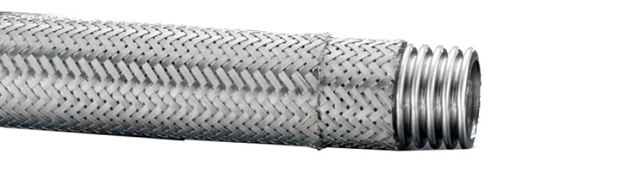 One or two layers of close weave metallic wire braid applied at the optimum angle is added to the outside of the hose to enhance the pressure capability of the hose. The hydroforming with water as the forming medium enables the corrugation to be formed from thicker material and and allows for the preferable deeper corrugations. This method of forming is also less stressful on the material assisting in a longer service life.